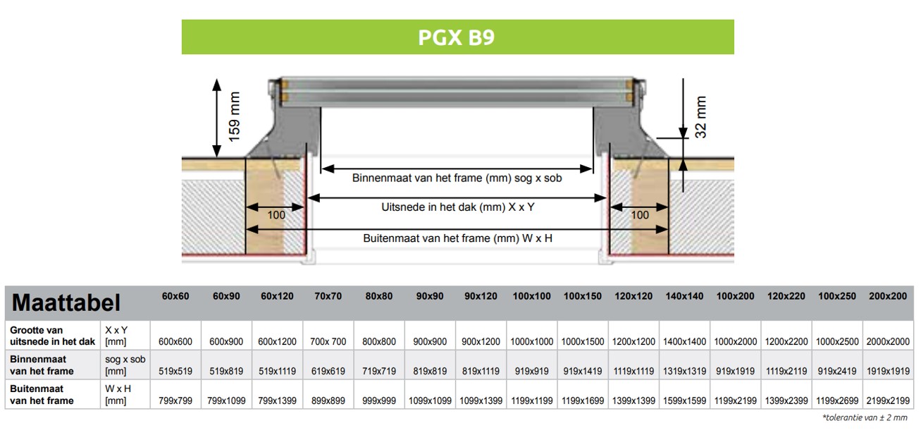 Het PGX B9 platdakraam is compleet voor montage op plat dak met een dakhelling tussen de 2-15 graden met onderhoudsvrije kunststof PVC dakopstand. Dit platdakraam weegt 330 kg, de maten kan je hieronder in de tabel vinden.