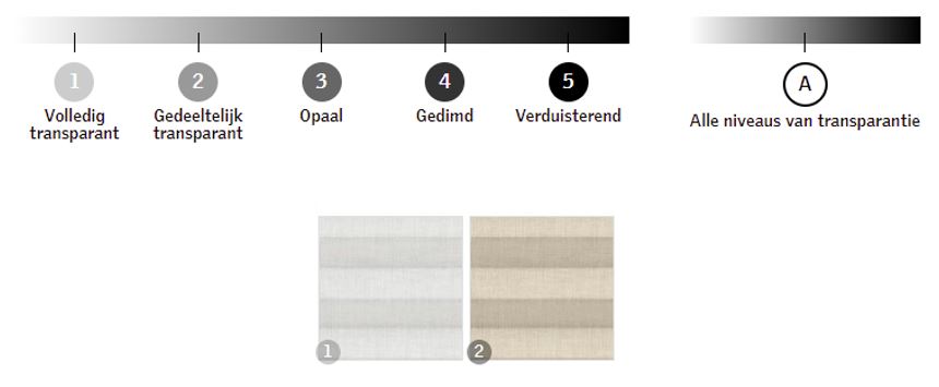 De cassette en zijgeleiding zijn in de kleur wit gelakt. De transparantie van de stof verschilt per kleur, u kunt hieronder de verschillende kleuren en transparantie niveau's vinden.